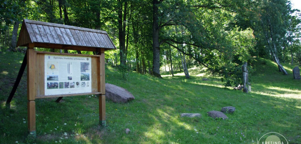 Andulių-Ėgliškių piliakalnio kompleksas stūkso į Dangės ir Šaltupio santaką įsiterpiančioje aukštumoje. Piliakalnis, įrengtas aukštumos pakraštyje, apjuostas plataus gynybinio pylimo. Į vakarus nuo jo, už iškastos griovos, išlikęs kyšulys, vadinamas Perkūno kalnu. Pasakojimai mena, kad čia buvusi pagonių šventykla, kurioje iki Antrojo pasaulinio karo stovėjo apeiginis akmuo, vadinamas Apierų akmeniu. Piliakalnis datuojamas X–XIII a. Jame lokalizuojama 1253–1290 m. minima Kretingos pilis. Manoma, kad ant Perkūno kalno prieš kryžiuočius sukilę kretingiškiai 1253 m. paaukojo savo dievams į nelaisvę paimtą Klaipėdos pilies komtūrą. Į rytus ir šiaurę nuo piliakalnio plyti II–XIII a. kapinynas ir I tūkst. pr. Kr. II pusės pilkapiai.