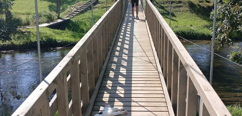 Pėsčiųjų tiltas per Šventąją įrengtas 1986m. Tiltas medinis ant metalinių lynų, nuo 1999 m. paskelbtas istorijos ir technikos paveldo objektas.