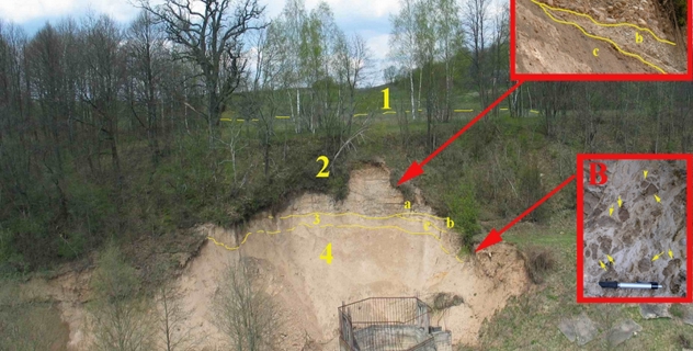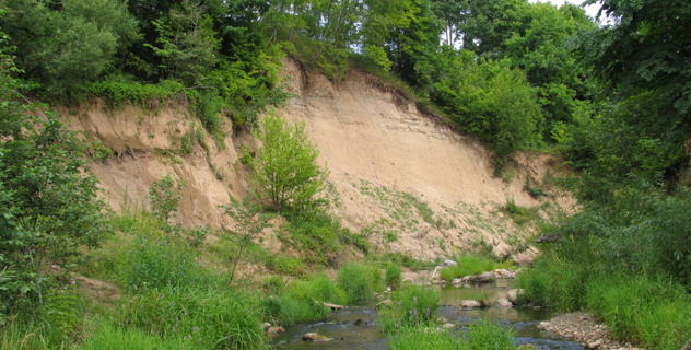 Dėl vėjo ir lietaus poveikio, nuolat byranti viršutinė atodangos dalis jau paslėpė nuo mūsų akių gilesnius nuogulų sluoksnius. Tačiau anksti pavasarį arba po smarkių liūčių išdžiūvusios atodangos fone, po žvirgždo–gargždo sluoksniu, dar galima pamatyti apie 0,5 m storio drėgno smulkaus smėlio sluoksnio kontūrą.