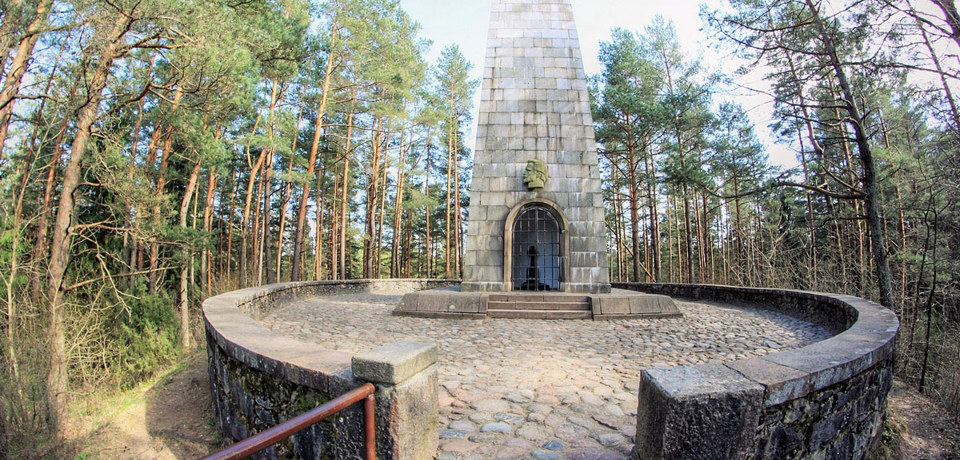 Jonas Biliūnas gimė 1879 m. Niūronių km., netoli Anykščių, mirė 1907 m. Zakopanės miestelyje, Tatrų kalnų papėdėje (dab. Lenkija). 1953 m. J.Biliūno palaikai iš Zakopanės buvo perlaidoti Anykščiuose ant šios kalvos. 1958 m. virš kapo iškilo 14 m aukščio architekto Vytauto Gabriūno paminklas – monumentas iš tašytų Anykščių apylinkių akmenų. To paties pavadinimo stebuklinėje pasakoje rašytojas pasakoja apie švytintį stebuklingą užrašą, pasirodžiusį ant aukšto stataus kalno viršūnės - tas, kuris užlips ant to kalno ir ranka pasieks užrašą, visus žmones padarys laimingus, o pats pavirs akmeniu.