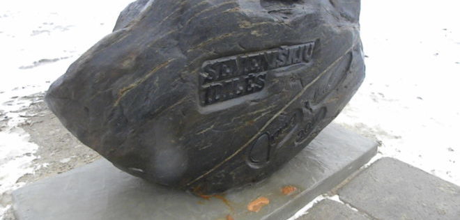 Paminklinis akmuo 2017 m. pastatytas netoli pirmosios Jono Meko tėvų sodybos vietos.