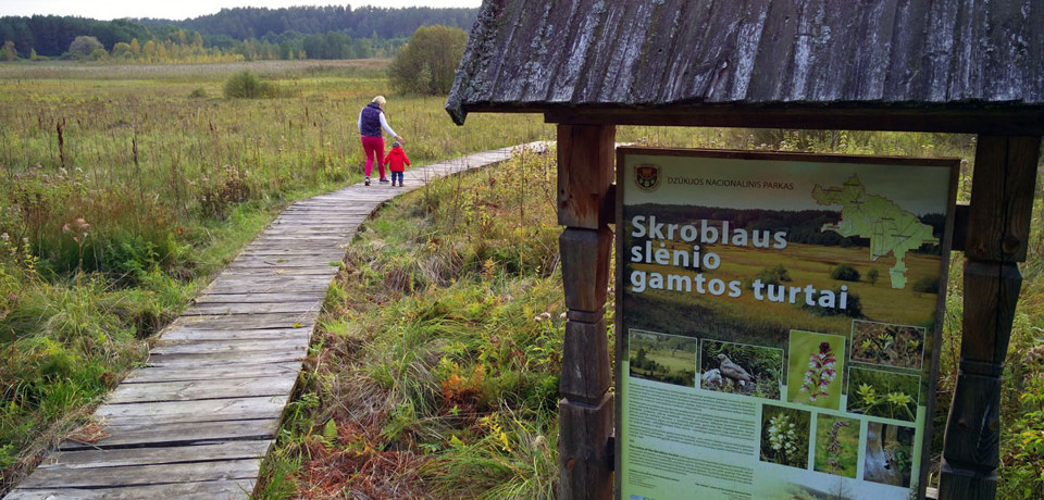 Skroblaus pažintinis takas veda per Kapiniškių kaimą link žemyninių kopų apsuptyje plytinčios nedidelės Bakanauskų pelkutės su Bakanauskų ežeru. Pats Bakanauskų ežeras ir jam užaugant susiformavusi pelkė atsirado dėl termokarstinių reiškinių – kai ištirpo nuo besitraukiančio ledyno atitrūkęs ir po sąnašomis palaidotas ledo luitas. Tokios nedidelės pelkės yra labai būdingos Dainavos smėlėtajai lygumai. Nuo pelkės pakraščio iki ežero nutiestas lieptas, kuriuo einant galima pamatyti visą pelkių augalijos įvairovę, o patogiai įsitaisius apžvalgos aikštelėje - pasigrožėti pelkių spalvomis ir kvapais. Keliaujant taku, galima susipažinti su vienu įspūdingiausių Lietuvos upeliu – Skroblumi. Kito tokio trumpo (17,3 km) ir tuo pat metu tokio vandeningo upelio Lietuvoje nėra. Ištakose iš Bobos daržo šaltinio Margionyse srūva tik 8 litrai vandens per sekundę, o į Merkį atplaukia jau 700 litrų per sekundę. Bobos daržo šaltinis yra vienas iš Skroblaus versmių šaltinių, paskelbtų hidrogeologiniu gamtos paminklu. Skroblaus versmėse požeminiai vandenys į paviršių išteka ne tik šlaituose. Vadinamajame „bobos darže“ jie veržiasi iš giluminių tarpmoreninių vandeningų sluoksnių aukštyn ir žemės paviršiuje telkiasi nedideliuose duburiuose, kuriuos vietiniai žmonės vadina „burbaklėmis“. Lieptu, nutiestu per užpelkėjusį duburį, galima nueiti iki paties šaltinio, kurio vanduo srūva iš žemės gelmėse pradingstančio urvo. Pasakojama, kad čia atsirasdavo visi Margionių kaimo vaikai, kuriuos tėvams iš šaltinio ištraukdavusi sena moteriškė. Didžioji Skroblaus slėnio dalis yra paskelbta rezervatine zona, čia lankytis yra draudžiama.