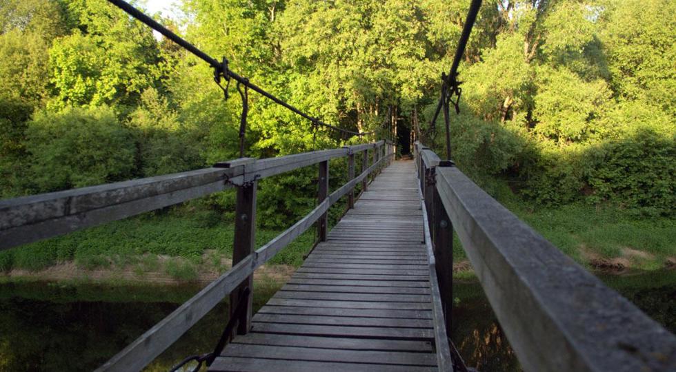 Galiausiai pasiekiamas piečiausias ir kartu egzotiškiausias šio maršruto taškas - Surviliškio kabantis tiltas. Pasivaikščiojimas šiuo lengvai siūbuojančiu tiltu, nuo kurio atsiveria puikus kraštovaizdis, paliks Jums neišdildomus, romantiškus įspūdžius.