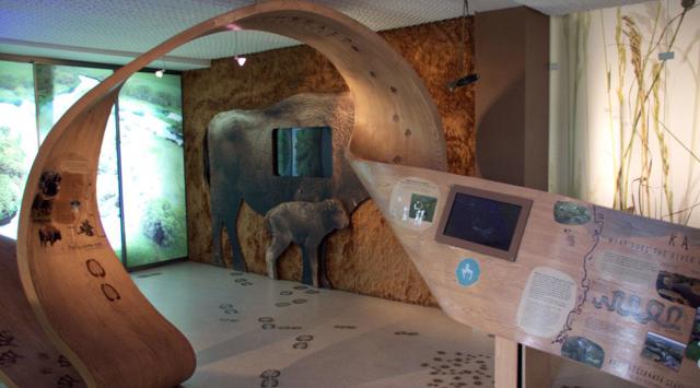 Krekenavos regioninio parko ekspozicijos pagrindinė tema - "Nevėžio upės senvagių įvairovė". Ekspozicinė juosta lankstosi per visą patalpos erdvę, atkartodama Nevėžio upės vingius, vienur sukdama į kairę, kitur - į dešinę, žemyn ir aukštyn, palikdama senvages ir užutekius. Informacija pateikiama įdomiais pasakojimais, iliustruotais išraiškingais dideliais vaizdais, atspindinčiais Nevėžio vidurupio senslėnio kraštovaizdžio charakteringiausius bruožus. Visoje patalpoje ant grindų ir lubų priklijuoti gyvūnų pėdsakai vedantys į ekspoziciją.